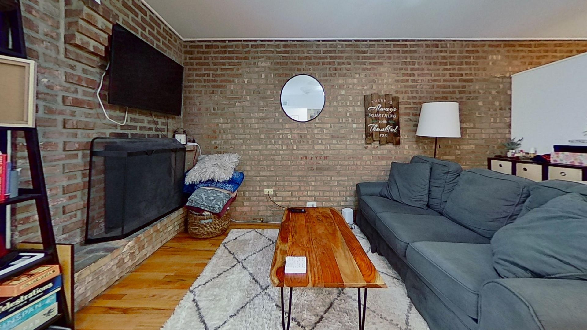 This ground floor unit features hardwood floors, dishwasher kitchen with granite counter tops and stainless steel appliances, beautiful exposed brick, decorative fireplace, gas forced air heat and air conditioning.