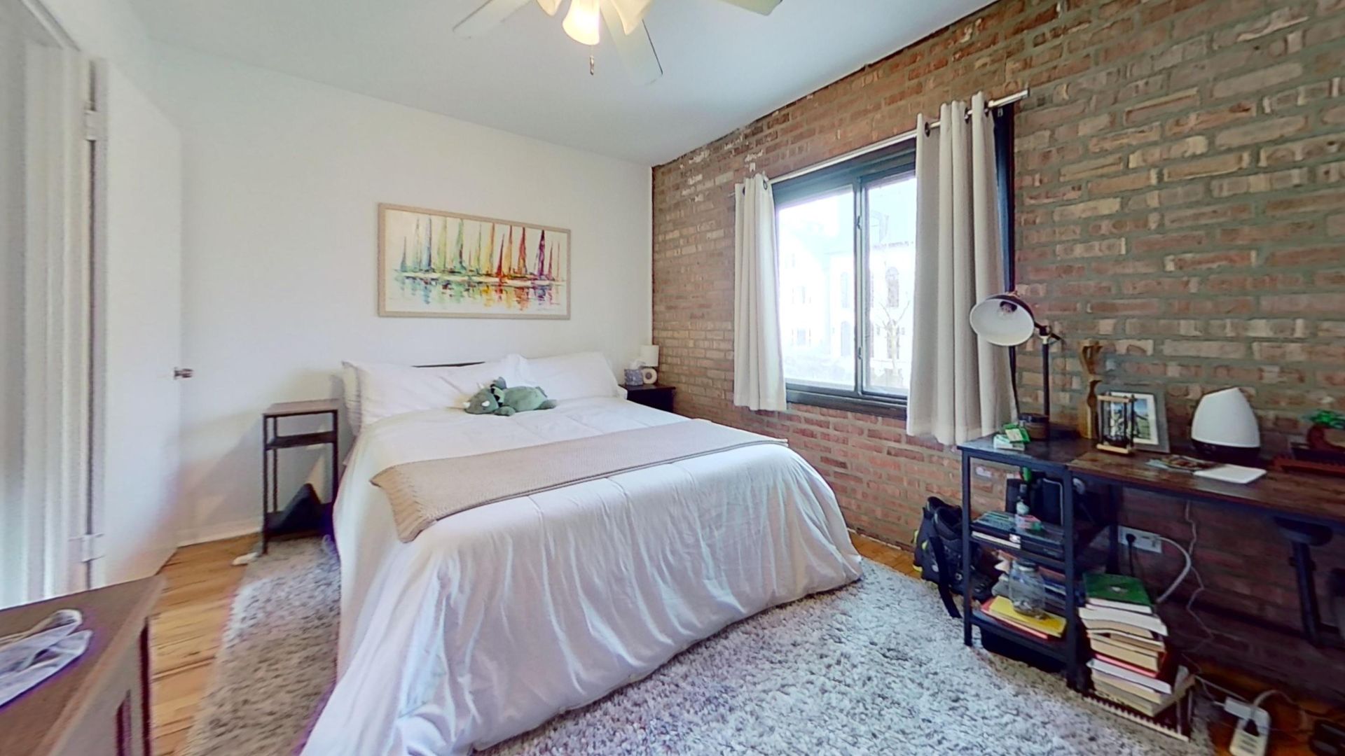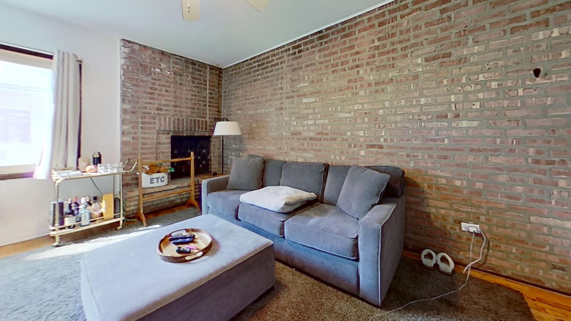 This top floor apartment features hardwood floors, breakfast bar kitchen with dishwasher, alarm system, decorative fireplace, exposed brick walls, gas-forced air heat, and air conditioning.